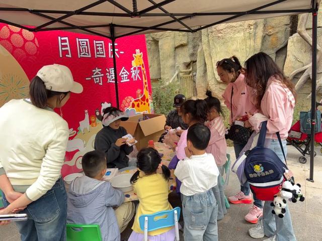 活动中,园区“双节”氛围营造亮点突出。南广场超大玉兔气模、印刻动物脚印的巨型月饼拼图地膜成网红打卡点。游客入园,可免费领取小国旗、国旗贴纸,在红旗阵列与国潮装饰中定格节日记忆。熊猫主题打卡点还推出了“发视频兑文创抵扣券”活动,进一步提升参与度。