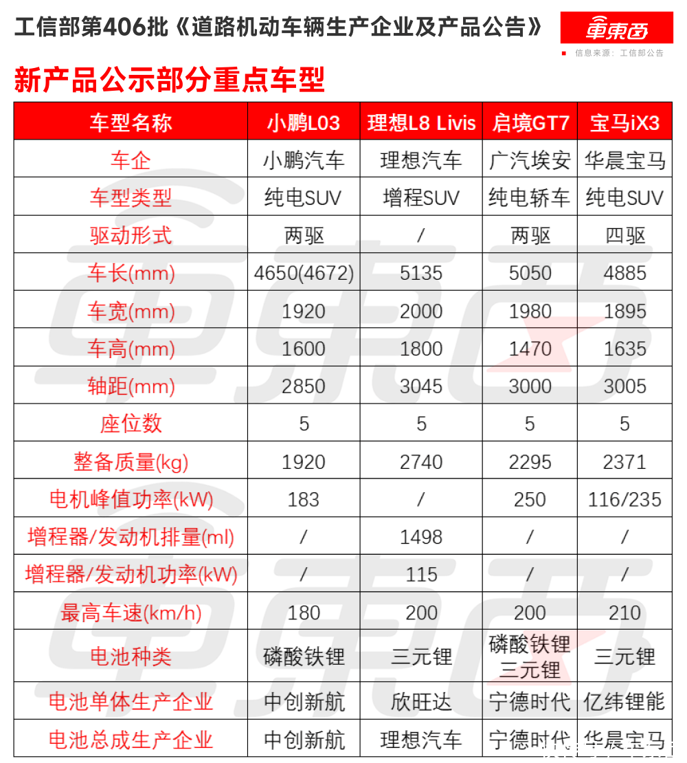 ▲工信部第406批《道路机动车辆生产企业及产品公告》新产品公示部分重点车型