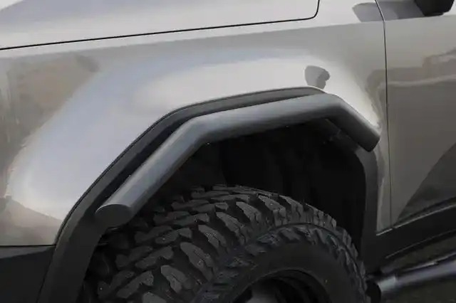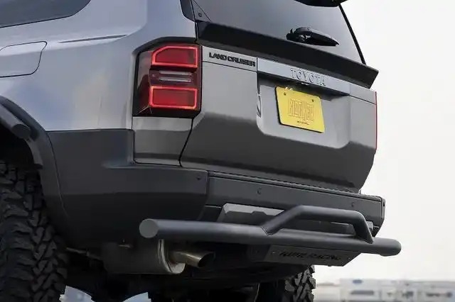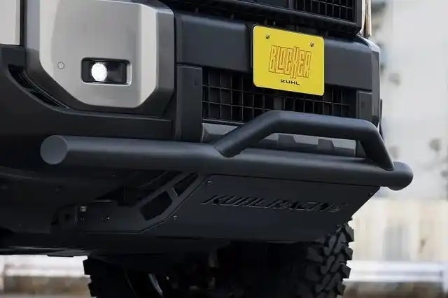 LC250拥有两套外观设计,KUHL RACING选择了更复古的圆灯造型版本,圆形复古大灯搭配黑色蜂窝状格栅,让车头既有野性张力,又不失细节精致度。原厂前包围基础上增加专属前保险杠保护器。直径超过70mm的粗钢管采用“向上翘起”的独特设计,既巧妙避开了原厂包围,又营造出强烈的运动感。底部那块印有“KUHL RACING”标志的钢板,如同一面坚固的盾牌,宣示着它的越野底气。