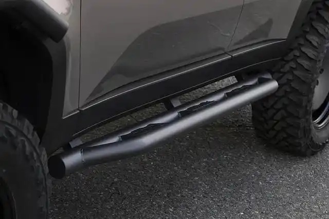 巨大的轮组直接突出于车体,KUHL RACING巧妙地在原厂挡泥板上加装了60mm钢管作为轮眉,粗粝的钢管设计不但能更好地保护车体,而且风格与前后护杠相呼应。加上卡扣式侧踏板同样采用超粗钢管打造,梯形向上弯曲的造型兼顾实用性与设计感,既能作为上下车踏板,又能在越野时保护侧裙。车顶低位弯管行李架与车身浑然一体,配上40英寸IPF LED灯条,夜间越野照明无忧。